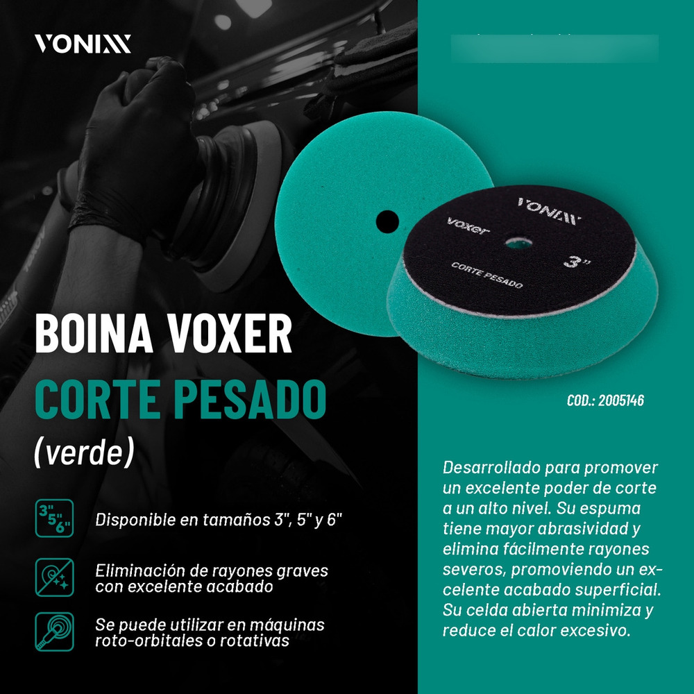 La boina Voxer Heavy Cut fue desarrollada para promover un excelente poder de corte a un alto nivel. Su espuma tiene mayor abrasividad y elimina fácilmente rayones severos, promoviendo un excelente acabado superficial. Su celda abierta minimiza y reduce el calor excesivo.
