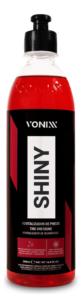 SHINY es un producto desarrollado exclusivamente para uso en neumáticos que renueva, protege y da brillo intenso y duradero a los neumáticos. El producto no se desprende al contacto con el agua y puede durar hasta 60 días, rinde de 15 a 20 aplicaciones en autos pequeños y mantiene la apariencia de brillo húmedo del neumático.