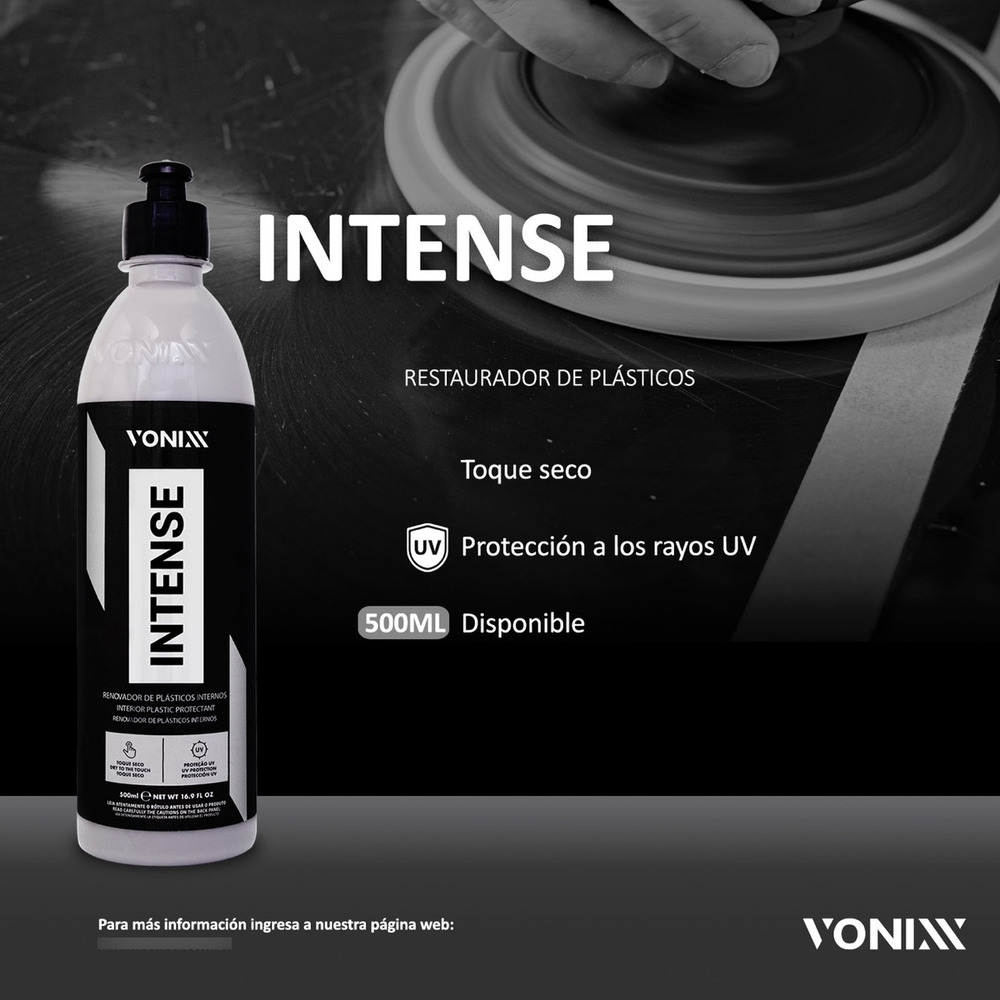 INTENSE es un renovador de plástico con protección UV, cuya fórmula equilibrada promueve un acabado natural y tacto seco, con una durabilidad de 6 meses. El producto debe usarse específicamente en el interior del automóvil, sobre superficies como vinilos y plásticos en general.
