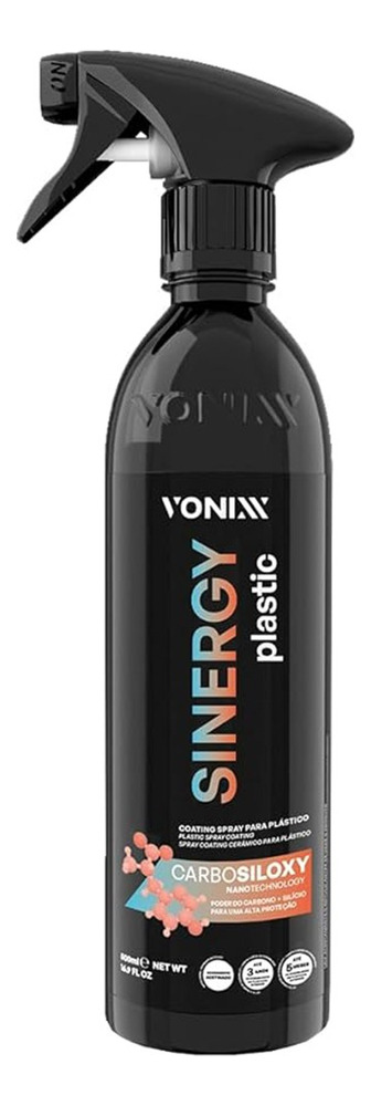 SINERGY PLASTIC SPRAY COATING es un protector a base de agua, que contiene carbono y silicio que actúan en sinergia para brindar protección por hasta tres años en los plásticos internos y cinco meses en los plásticos externos del vehículo. La tecnología CARBOSILOXY hace que el carbono presente en la composición enlace doblemente el silicio con el plástico, para aumentar la durabilidad.