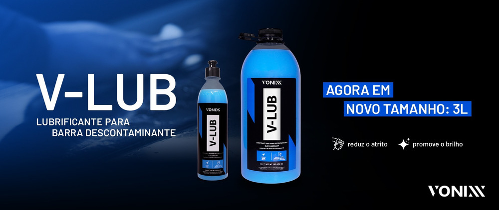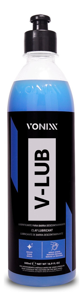 VV-Lub es un lubricante de pintura especialmente desarrollado para su uso en conjunto con Vonixx V-Bar o barras descontaminantes en general. V-Lub contiene agentes lubricantes de última generación que reducen la fricción de la barra descontaminante, permitiendo que la V-Bar se deslice suavemente sobre la pintura y reduciendo las posibilidades de rayones, además de facilitar el trabajo. El producto contiene polímeros de alta tecnología que favorecen el brillo y ayudan a proteger la pintura.
